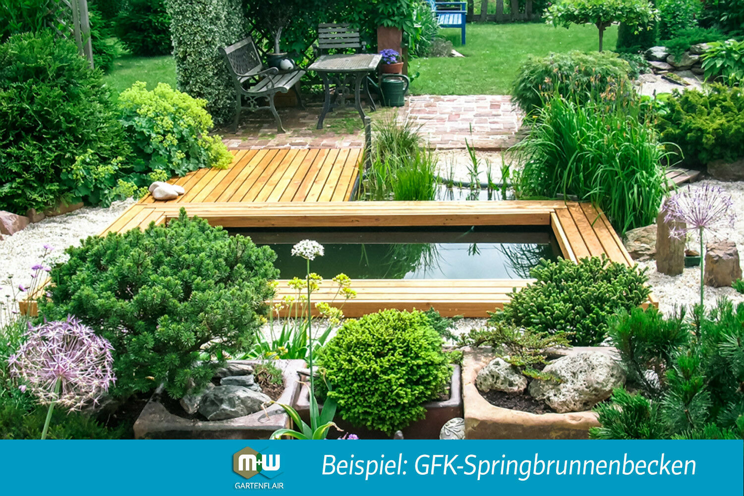 Mit der optionalen Abdeckung, sowie dem entsprechenden Lastensockel, haben Sie die Möglichkeit das Becken als Springbrunnenbecken zu verwenden. Auf dem Deckel können Sie z.B. Quellsteine aufstellen und so ansprechende Wasserspiele gestalten. Der Beckenrand dient vorrangig der Stabiliät des Beckens und sollte immer überlegt werden (z.B. mit Holz oder Steinen).